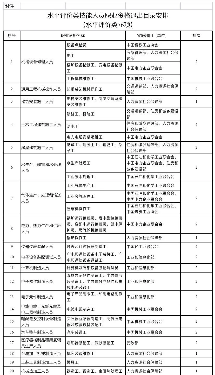 为贯彻落实2019年12月30日国务院常务会议精神,拟分批将水平评价类技能人员职业技能退出目录,其中:人力资源社会保障部门和有关部门组织实施的14项职业技能(涉及29个职业)拟于9月30日前第一批退出;其他部门(单位)组织实施的66项职业技能(涉及156个职业)拟于12月31日前第二批退出;与公共安全、人身健康等密切相关的职业(工种)拟依法调整为准入类职业技能(具体安排详见附件)。